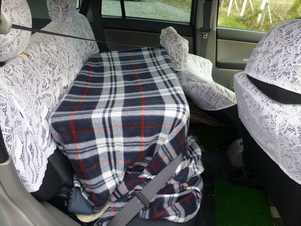自動車の後部座席にシートベルトと助手席を倒して固定