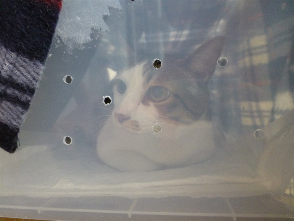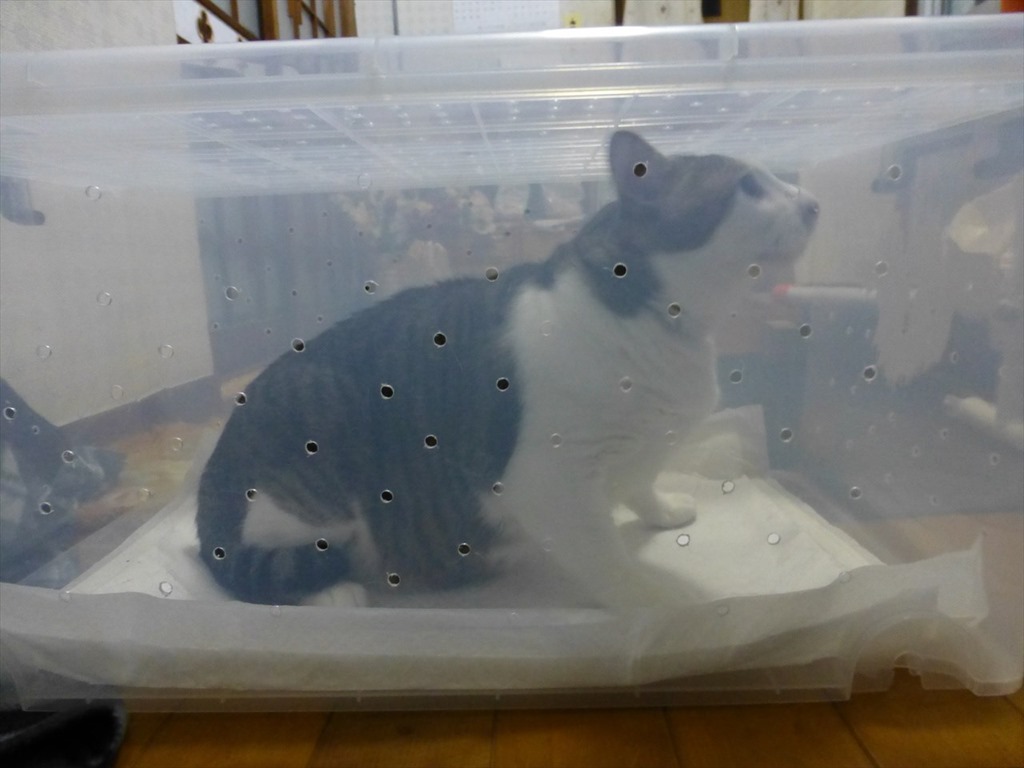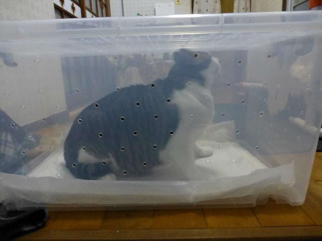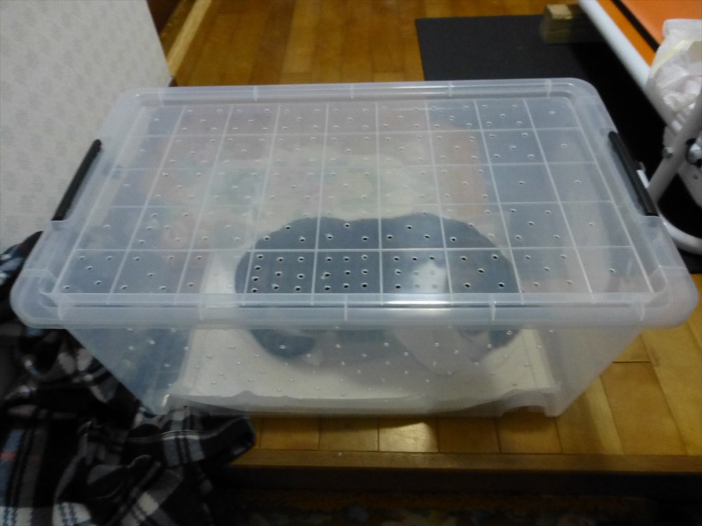 蓋にピントがあってしまってレオがちゃんと移って居ないが、コメリでかった透明の衣装ケースにドリルで穴を開けまくった自作キャリーを使わなくなった着る毛布で包んで運搬。キャリーが良いのか毛布で目隠しするのが良いのか、レオがパニックを起こさなくなったのは前回からこの様にして運ぶようになってから。