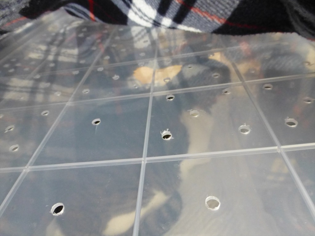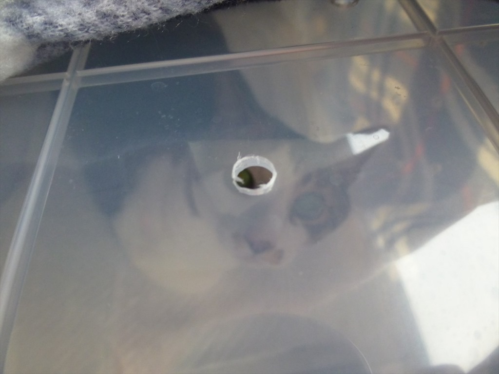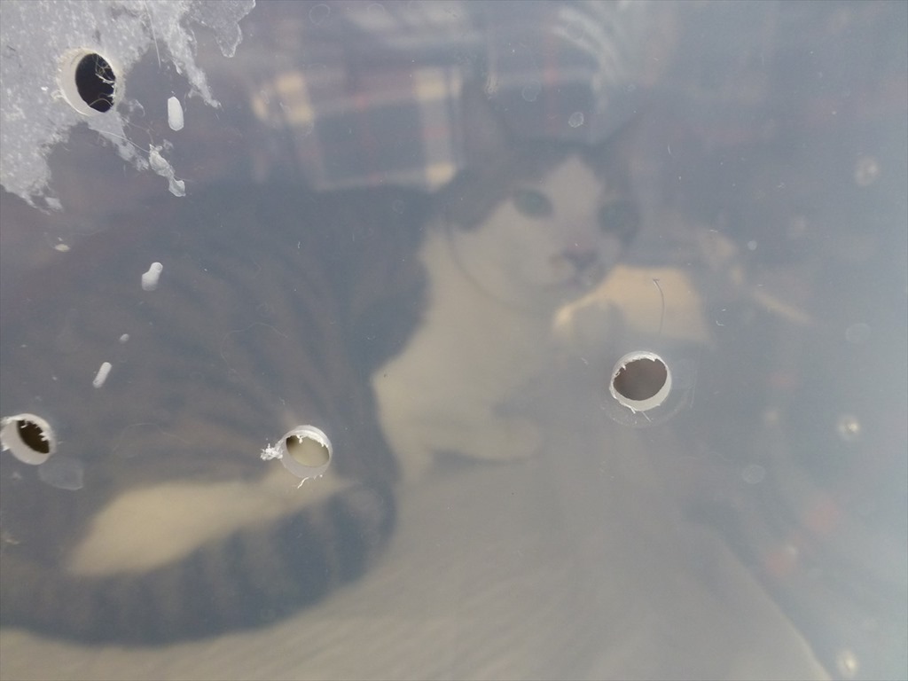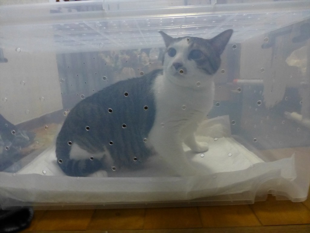 蓋にピントがあってしまってレオがちゃんと移って居ないが、コメリでかった透明の衣装ケースにドリルで穴を開けまくった自作キャリーを使わなくなった着る毛布で包んで運搬。キャリーが良いのか毛布で目隠しするのが良いのか、レオがパニックを起こさなくなったのは前回からこの様にして運ぶようになってから。