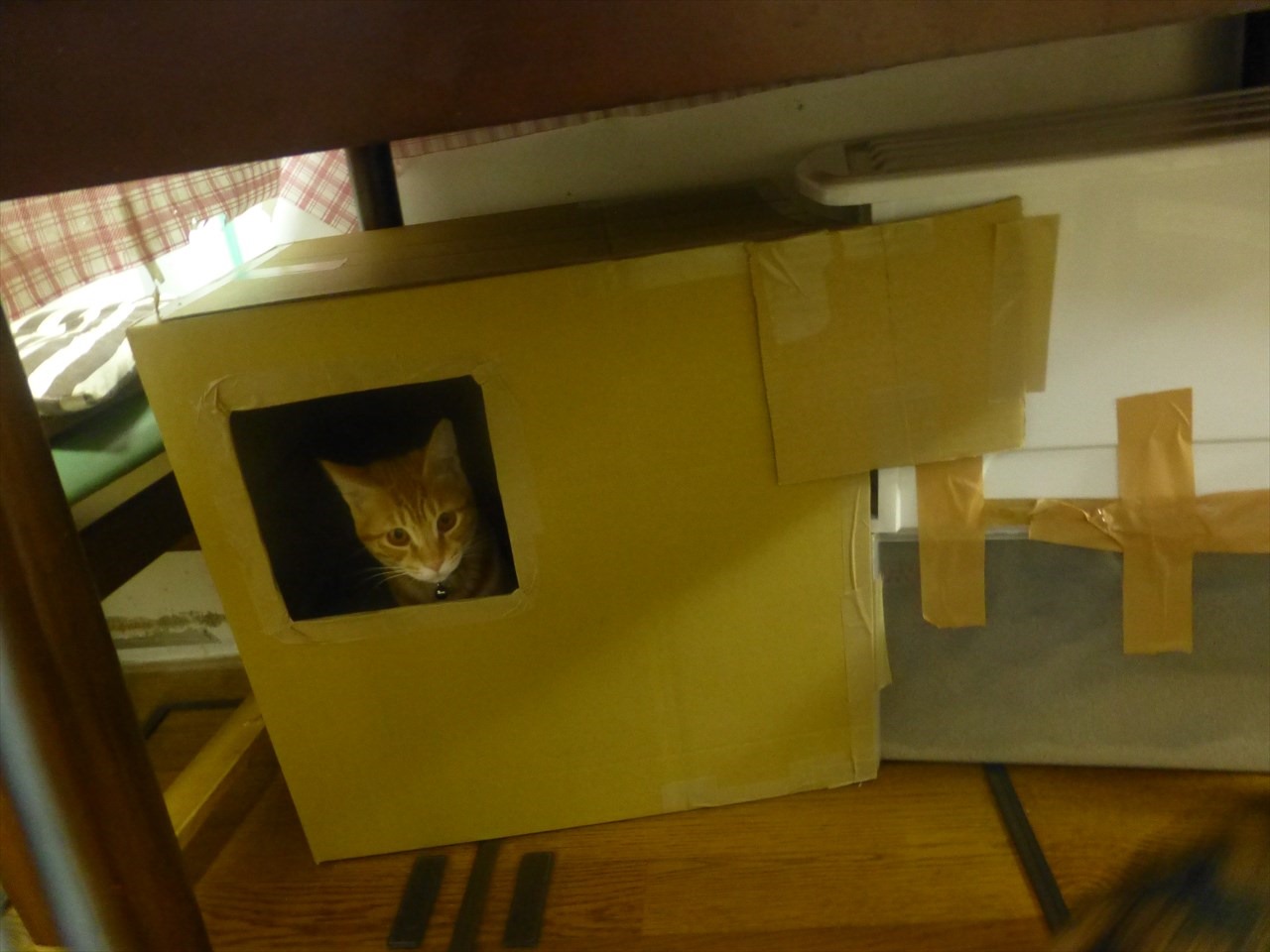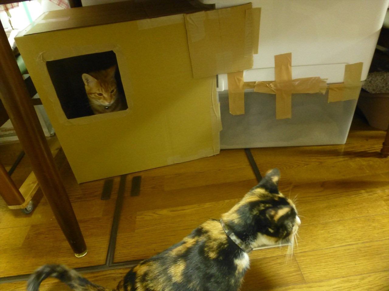 昼過ぎに猫達をダイニングに放すと、いつものトイレが有る場所に違うものがあるので物珍しそうに観察し、入り口があるので入ってみる。