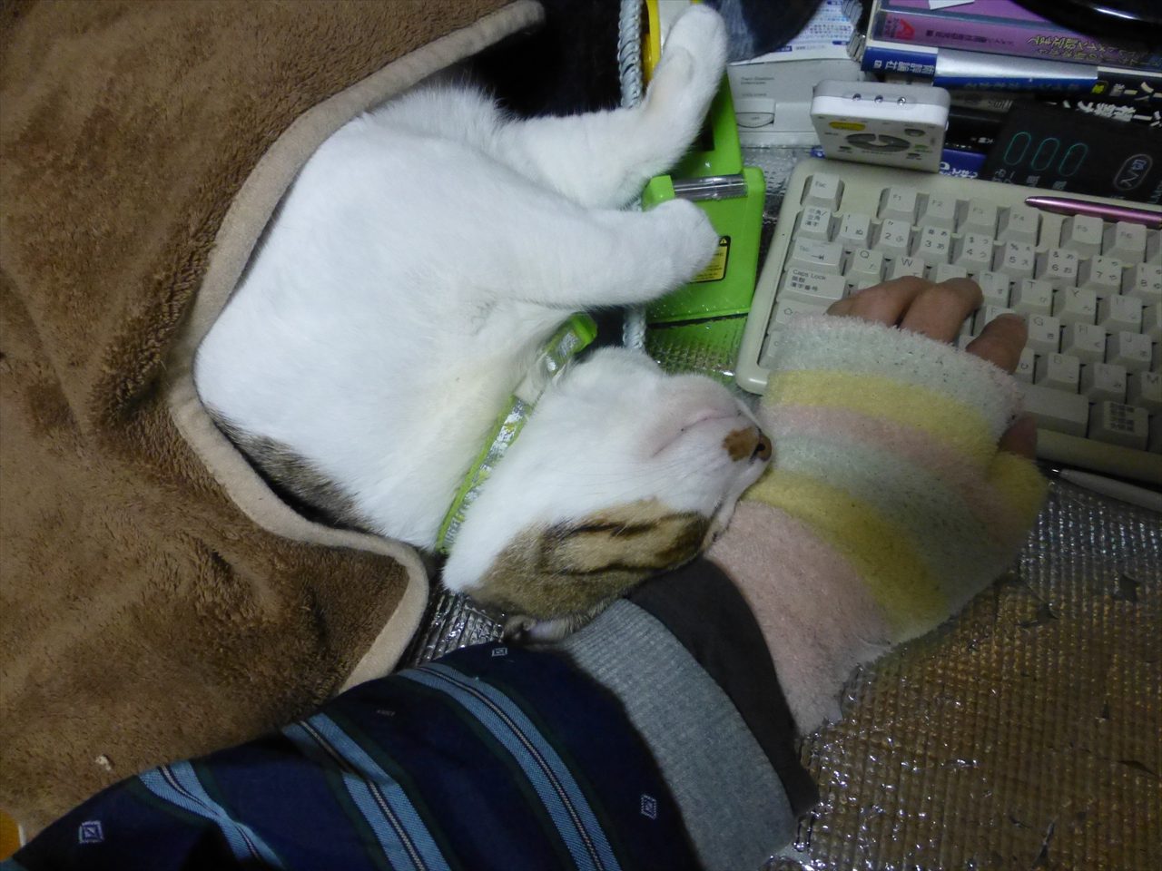 昨夜0時46分頃、土間の電気を付けて子猫の様子を見る。ベッドから寝ていた三毛の方が出てきてわざわ