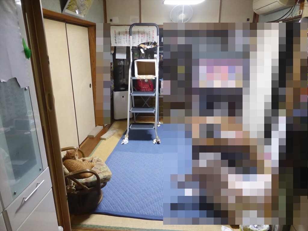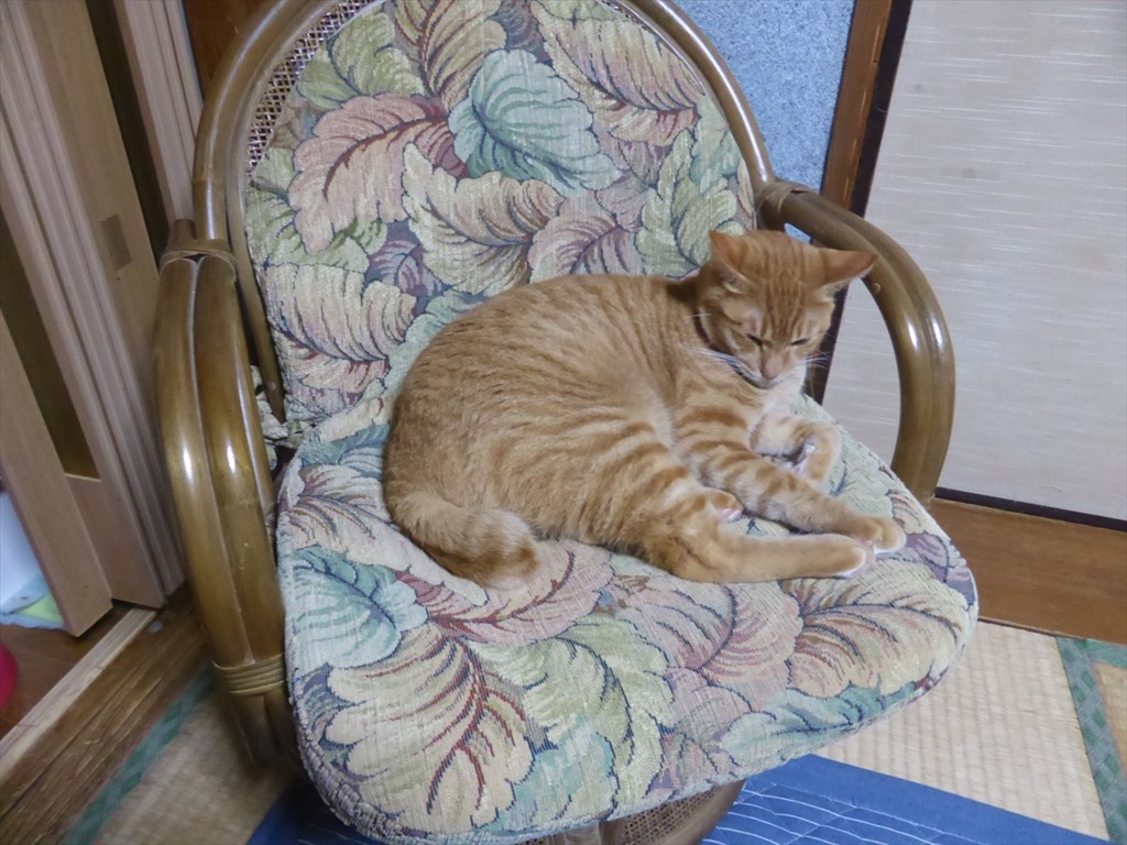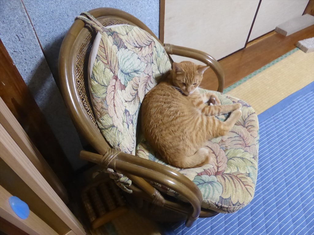 茶の間に置いた脚立の上でくつろぐミケと椅子の上で休むチャトラ。たまに場所を入れ替わる。
