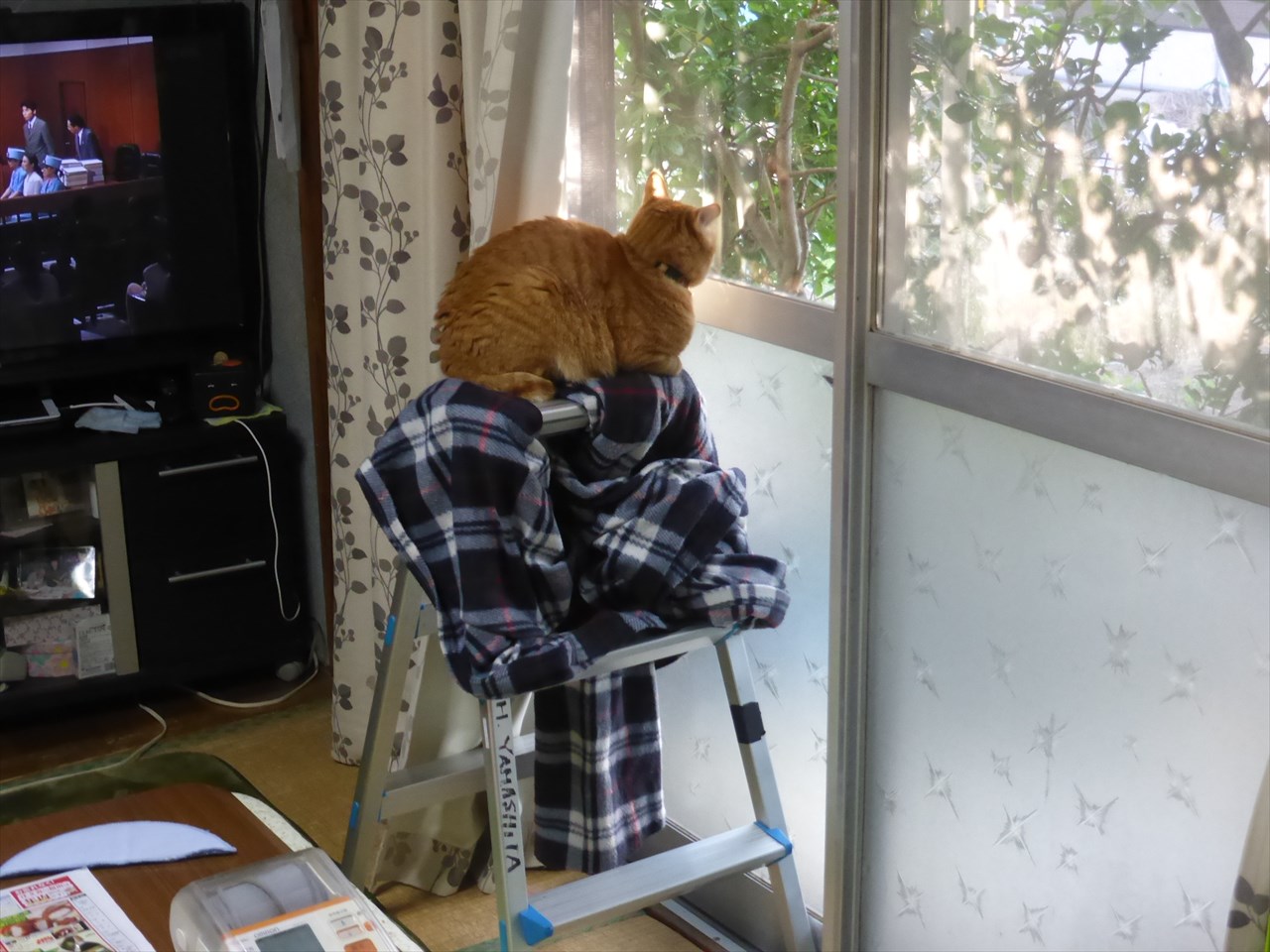脚立の上から窓の外を眺めるチャトラ。毎日朝茶の間に連れて行くと行う日課。
