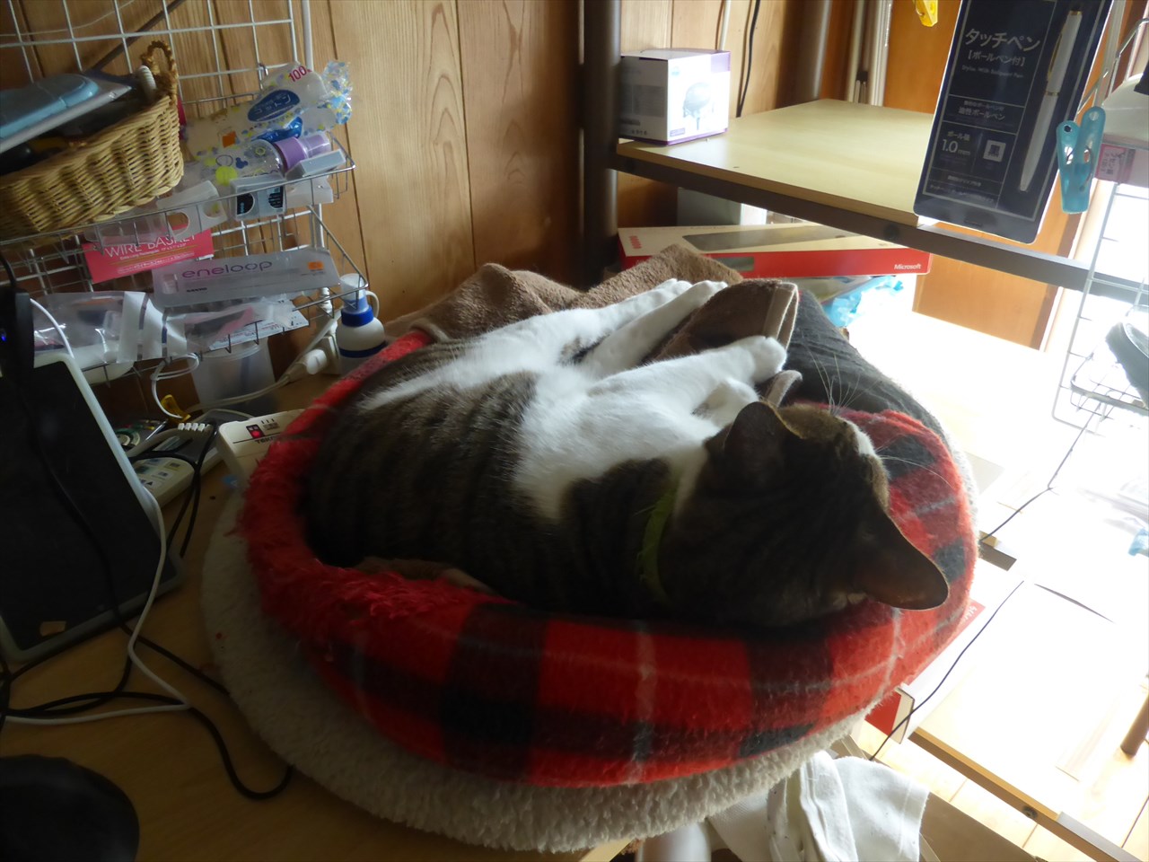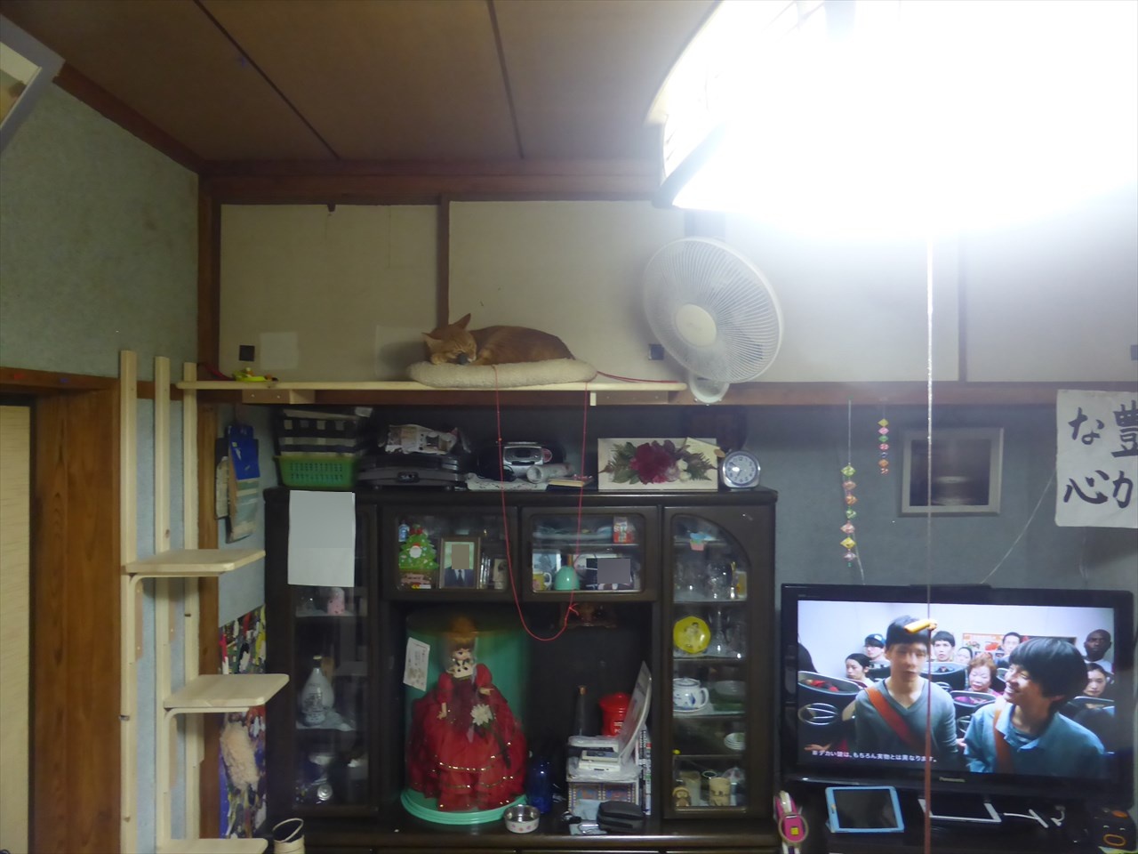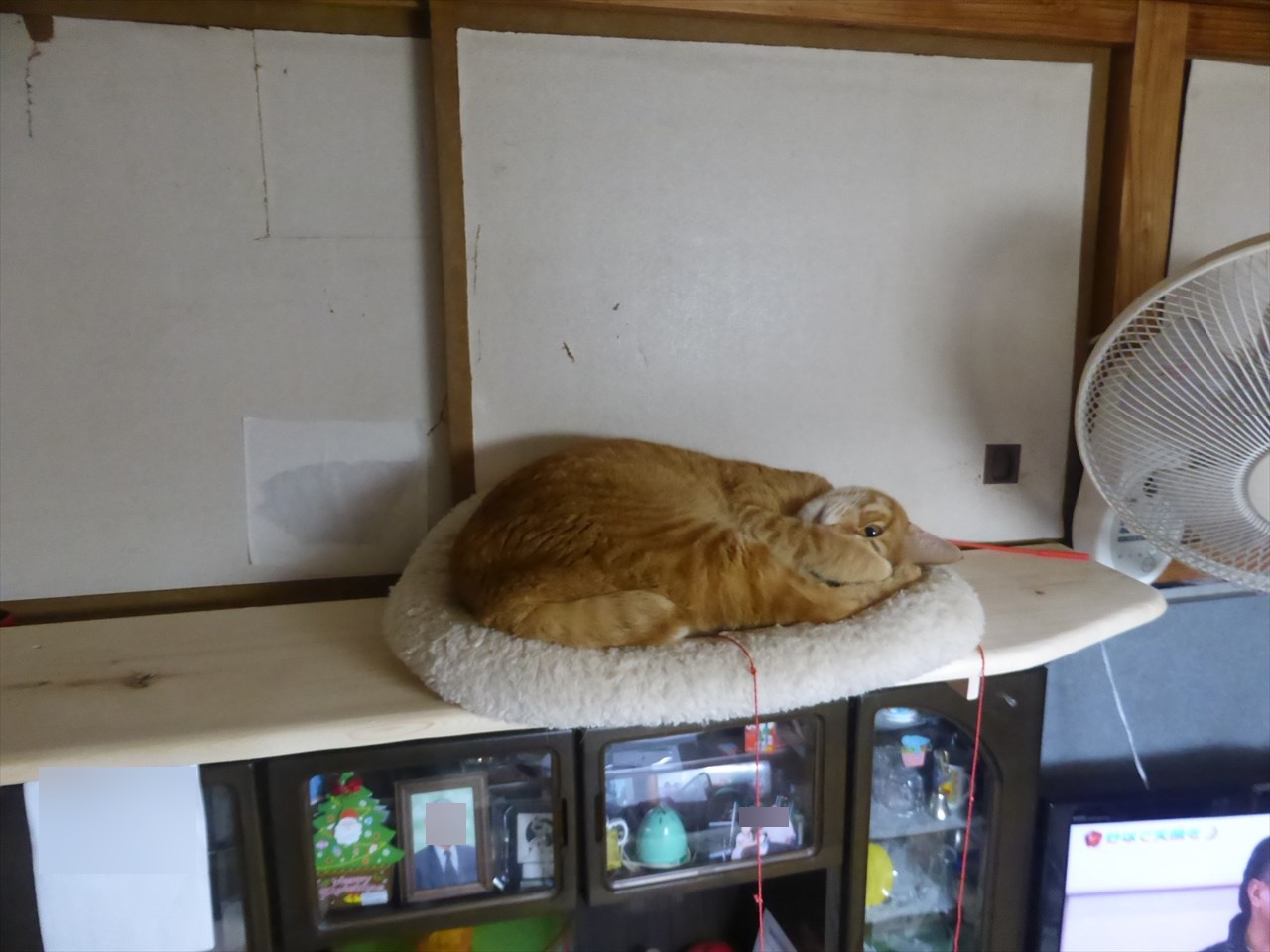 帰省してきた弟の尽力により、チャトラがキャットウォークの上で寝てくれるようになった。